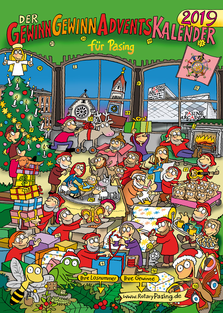Werner Tiki Küstenmacher, weit über München hinaus bekannter Autor und Karikaturist, hat heuer wieder das Erscheinungsbild des Adventskalenders gestaltet. An den 4 Samstagen ab dem 9. November bis zum ersten Advent können die Adventskalender am Verkaufsstand des Rotary Club München-West in den Pasing Arcaden erworben werden. Jederzeit ist der Kalender bei „Brioche Dorée“ im Erdgeschoss der Pasing Arcaden erhältlich.