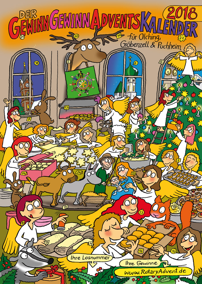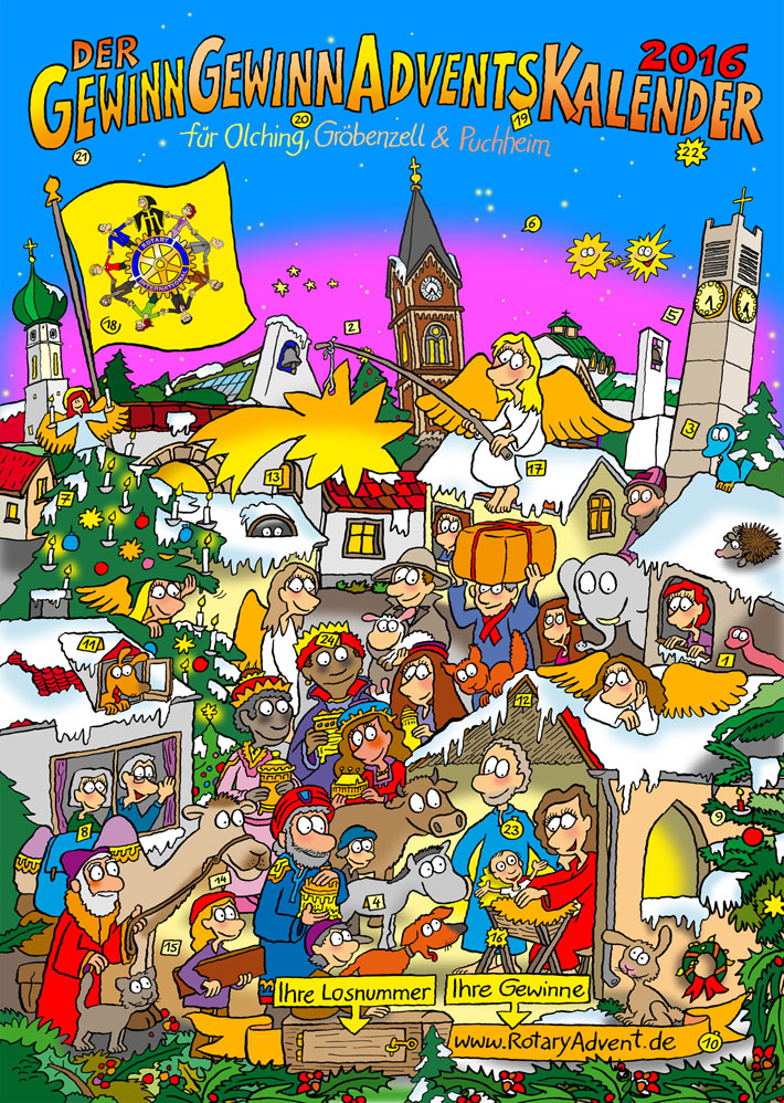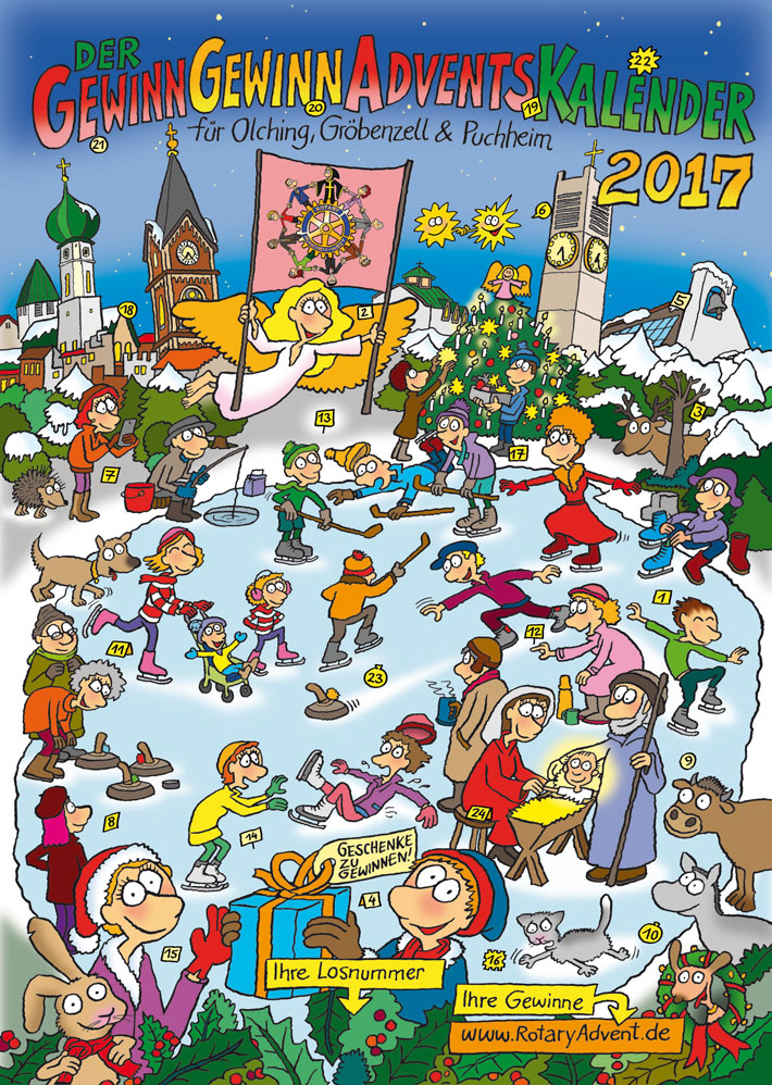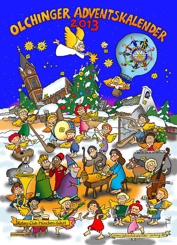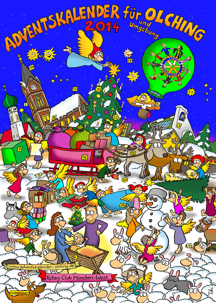 Werner Tiki Küstenmacher, weit über München hinaus bekannter Autor und Karikaturist, hat heuer wieder das Erscheinungsbild des Adventskalenders gestaltet. An den 4 Samstagen ab dem 9. November bis zum ersten Advent können die Adventskalender am Verkaufsstand des Rotary Club München-West in den Pasing Arcaden erworben werden. Jederzeit ist der Kalender bei „Brioche Dorée“ im Erdgeschoss der Pasing Arcaden erhältlich.